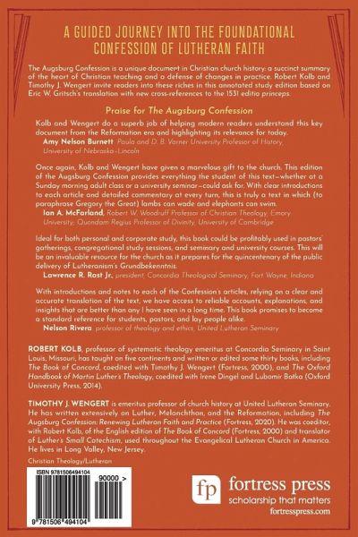 The Augsburg Confession is a unique document in the history of the Christian church, containing both a succinct summary of the heart of Christian teaching and a defense of the changes in practice introduced by Martin Luther and the Wittenberg reformers. Robert Kolb and Timothy J. Wengert invite readers on an accessible journey into the heart of this foundational confession--as well as the minds of primary author Philip Melanchthon and the other reformers at the heart of the emerging Lutheran movement. Kolb and Wengert use the version of the Augsburg Confession translated by Eric W. Gritsch for the 2000 Book of Concord, but also offer readers fresh insight into the history and evolution of this document by including cross-references to the editio princeps of 1531, the first official published edition of the confession. In addition to thorough introductions to the document and to each article, readers will benefit from extensive footnotes, extensive marginal comments, and appendices including important variations from the editio princeps, topics for discussion tailored to each article, and suggestions for further reading.