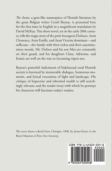 The Aunts, a gem-like masterpiece of Flemish literature by the great Belgian writer Cyriel Buysse, is presented here for the first time in English in a magnificent translation by David McKay. This short novel, set in the early 20th century, tells the tragic story of the petit-bourgeois Dufours. Aunt Clemence, Aunt Estelle, and Aunt Victoire dominate-and suffocate-the family with their riches and their sanctimonious morals. Mr. Dufour and his son Max are constantly on their guard, and his daughters Clara, Adrienne, and Esmée are well on the way to becoming vipers too. Buysse's powerful indictment of hidebound rural Flemish society is leavened by memorable dialogue, humorous moments, and lyrical evocations of light and landscape. His critique of hypocrisy and inherited wealth is still scorchingly relevant, and the tender irony with which he portrays his characters will fascinate today's readers.