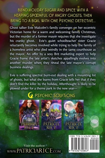 Blend holiday sugar and spice with a heaping spoonful of angry ghosts, then bring to a boil with one psychic detective... Ghost talker Evie Malcolm's family converges on her eccentric Victorian home for a warm and welcoming family Christmas, but the murder of a former mayor requires that she investigate his cranky ghost. Evie's quiet schoolteacher sister Gracie reluctantly becomes involved while trying to help the family of a homeless artist who died weirdly in the same courthouse as the mayor. An offer by a sexy Brit marketing expert to help Gracie frame the late artist's sketches appallingly evolves into another murder when they reveal the late mayor's corrupt business dealings. Evie is suffering spectral burn-out dealing with a mounting list of ghosts, but what she learns from Gracie tells her that if they don't find the killer by the holiday, Afterthought is likely to be plowed under for a theme park in the new year-