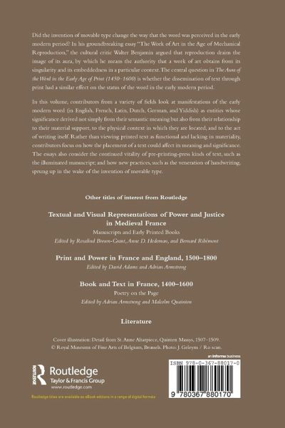 Did the invention of movable type change the way that the word was perceived in the early modern period? In his groundbreaking essay "The Work of Art in the Age of Mechanical Reproduction," the cultural critic Walter Benjamin argued that reproduction drains the image of its aura, by which he means the authority that a work of art obtains from its singularity and its embeddedness in a particular context. The central question in The Aura of the Word in the Early Age of Print (1450-1600) is whether the dissemination of text through print had a similar effect on the status of the word in the early modern period. In this volume, contributors from a variety of fields look at manifestations of the early modern word (in English, French, Latin, Dutch, German and Yiddish) as entities whose significance derived not simply from their semantic meaning but also from their relationship to their material support, to the physical context in which they are located and to the act of writing itself. Rather than viewing printed text as functional and lacking in materiality, contributors focus on how the placement of a text could affect its meaning and significance. The essays also consider the continued vitality of pre-printing-press kinds of text such as the illuminated manuscript; and how new practices, such as the veneration of handwriting, sprung up in the wake of the invention of movable type.
