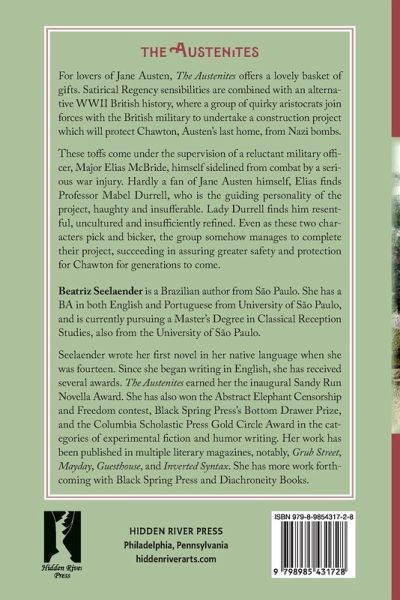 About The Austenites: For lovers of Jane Austen, The Austenites offers a lovely basket of gifts. Satirical Regency sensibilities are combined with an alternative WWII British history, where a group of quirky aristocrats join forces with the British military to undertake a construction project which will protect Chawton, Austen's last home, from Nazi bombs. These toffs come under the supervision of a reluctant military officer, Major Elias McBride, himself sidelined from combat by a serious war injury. Hardly a fan of Jane Austen himself, Elias finds Professor Mabel Durrell, who is the guiding personality of the project, haughty and insufferable. Lady Durrell finds him resentful, uncultured and insufficiently refined. Even as these two characters pick and bicker, the group somehow manages to complete their project, succeeding in assuring greater safety and protection for Chawton for generations to come. About the author: Beatriz Seelaender is a Brazilian author from São Paulo. She has a BA in both English and Portuguese from University of São Paulo, and is currently pursuing a Master's Degree in Classical Reception Studies, also from the University of São Paulo. Seelaender wrote her first novel in her native language when she was fourteen. Since she began writing in English, she has received several awards. "The Austenites" earned her the inaugural Sandy Run Novella Award. She has also won the Abstract Elephant Censorship and Freedom contest, The Black Spring Press's Bottom Drawer Prize, and the Columbia Scholastic Press Gold Circle Award in the categories of experimental fiction and humor writing. Her work has been published in multiple literary magazines, notably, Grub Street, Mayday, Guesthouse, and Inverted Syntax. She has more work forthcoming in Black Spring Press and Diachroneity Books.