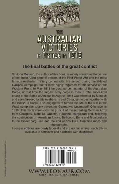 The final battles of the great conflict Sir John Monash, the author of this book, is widely considered to be one of the finest Allied general officers of the First World War and the most famous Australian military commander. He served during the ill-fated Gallipoli Campaign, but is most highly regarded for his service on the Western Front. In May 1918 he became commander of the Australian Corps, at that time the largest army corps in theatre. The successful attack of the Battle of Amiens in August, 1918 was planned by Monash and spearheaded by his Australians and Canadian forces together with the British III Corps. This engagement turned the tide of the war in the West comprehensively reversing Germany's Ludendorff Offensive in 1918. This book chronicles the pursuit of the retreating German Army from Chuignes, Mont St. Quentin, Peronne, Hargicourt and, following the contribution of American forces, Bellicourt, Bony and Montbrehain to the Hindenburg Line and the end of hostilities. Contains maps and photographs. Leonaur editions are newly typeset and are not facsimiles; each title is available in softcover and hardback with dustjacket.