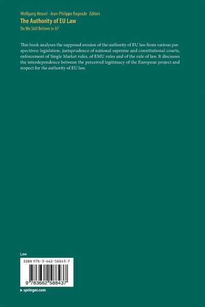 This book analyses the supposed erosion of the authority of EU law from various perspectives: legislation, jurisprudence of national supreme and constitutional courts, enforcement of Single Market rules, of EMU rules and of the rule of law. It discusses the interdependence between the perceived legitimacy of the European project and respect for the authority of EU law.