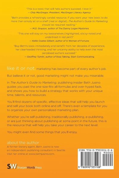 Like it or not, marketing has become part of every author's job. But believe it or not, marketing doesn't have to make you miserable. In The Author's Guide to Marketing, publishing insider Beth Jusino guides you past the one-size-fits-all formulas and over-hyped fads, and shows you how to build a strategy that works with your unique time, talents, and resources. You'll find dozens of ideas that will help you launch and sell your book both online and off. There's even a template for you to organize your own personalized marketing plan. Whether you're self publishing, traditionally publishing, e-publishing, or are just thinking about publishing at some point in the future, this is the resource that will help you take your career to the next level. You might even find some things that you'll enjoy.