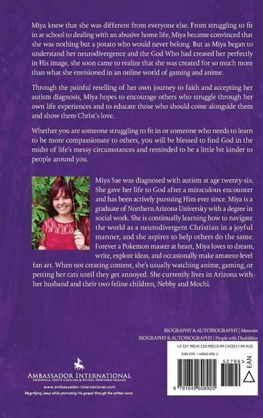 Miya knew that she was different from everyone else. From struggling to fit in at school to dealing with an abusive home life, Miya became convinced that she was nothing but a potato who would never belong. But as Miya began to understand her neurodivergence and the God Who had created her perfectly in His image, she soon came to realize that she was created for so much more than what she envisioned in an online world of gaming and anime. Through the painful retelling of her own journey to faith and accepting her autism diagnosis, Miya hopes to encourage others who struggle through her own life experiences and to educate those who should come alongside them and show them Christ's love. Whether you are someone struggling to fit in or someone who needs to learn to be more compassionate to others, you will be blessed to find God in the midst of life's messy circumstances and reminded to be a little bit kinder to people around you. This book is a beautiful read, regardless of your faith, or lack of it. Miya's writing takes us into her world with painful honesty and eloquence. We accompany Miya through her autism diagnosis and her Christian faith, discovering as she did, how both are entwined and how learning over time about what both mean to her, have shaped who she is to today. I read this in one sitting, intrigued to know more. A great book. Sarah Hendrickx autistic author With vivid words and a robust sense of humor, Miya Sae paints an informative and inspirational picture of the life of an autistic Christian. It's a treasure to see an individual who's so unapologetic about her faith and her differences. This wonderfully crafted memoir will have readers both giggling over the highly relatable scenarios and wiping away an empathetic tear. Inside these pages is Christianity and neurodivergence at its most pure and base form-no brain-bending theology or head-scratching terminology. It is simply a warm cup of coffee for the soul-mixtures of a bitter past, a flavorful transition, and the warmth of our Savior. Moriah Jane author and founder of Finding God in Anime This beautifully written, heartfelt memoir allows readers to gain a better understanding of the neurodivergent world, as told through Miya Sae's experiences. Sae is authentically raw, and readers can clearly see God at work through the seasons of her life. The Autistic Whosoever will resonate with readers (neurodivergent and neurotypical alike) who may feel alone in their walk to discover how God can use their perceived weaknesses to accomplish His plans. Leslie L. McKee award-winning author of Hope Amid the Pain: Hanging on to Positive Expectations When Battling Chronic Pain and Illness Miya Sae's memoir of her experience is a story of growth and challenges and a discourse of what one's faith means. She leans into her vulnerability in the hard moments, while deftly weaving in a touch of humor. For anyone who may have felt unseen at any point, this healing journey of embracing life and oneself is for you. Judy Liu author of The Vending Portal The Autistic Whosoever is a wonderfully written, deeply personal journey through the author's life, touching on themes of pain, love, heartbreak, resilience, bravery, self-discovery, and the profound love of Christ. Sae offers powerful insight into what it's like to live with autism, urging us all to advocate for a more inclusive world, where every individual feels seen, valued, and accepted just as they are. God's goodness shines through every page of this soul-stirring story. A beautiful, brilliant read! Kathryn M. Inman author of Counting Spoons - a Memoir of Heroin, Heartache, and Hope