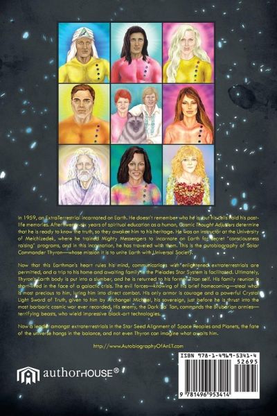 In 1959, an ExtraTerrestrial incarnated on Earth. He doesn't remember who he is; but his cells hold his past-life memories. After twenty-six years of spiritual education as a human, Cosmic Thought Adjusters determine that he is ready to know the truth, so they awaken him to his heritage. He was an instructor at the University of Melchizedek, where he trained Mighty Messengers to incarnate on Earth for secret "consciousness raising" programs, and in this incarnation, he has traveled with them. This is the autobiography of Solar Commander Thyron-whose mission it is to unite Earth with Universal Society. Now that this Earthman's heart rules his mind, communications with enlightened extraterrestrials are permitted, and a trip to his home and awaiting family in the Pleiades Star System is facilitated.Ultimately, Thyron's Earth body is put into a slumber, and he is returned to his former Titan self. His family reunion is short-lived in the face of a galactic crisis. The evil forces-knowing of his brief homecoming-steal what is most precious to him, luring him into direct combat. His only armor is courage and a powerful Crystal Light Sword of Truth, given to him by Archangel Michael, his sovereign, just before he is thrust into the most barbaric cosmic war ever recorded. His enemy, the Dark Sa' Tan, commands the Brubarian armies-terrifying beasts, who wield impressive black-art technologies. Now a leader amongst extraterrestrials in the Star Seed Alignment of Space Peoples and Planets, the fate of the universe hangs in the balance, and not even Thyron can imagine what awaits him. http://www.AutobiographyOfAnET.com