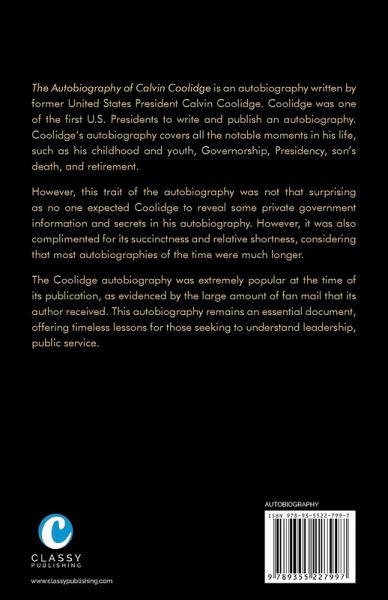 The Autobiography of Calvin Coolidge is an autobiography written by former United States President Calvin Coolidge. Coolidge was one of the first U.S. Presidents to write and publish an autobiography. Coolidge's autobiography covers all the notable moments in his life, such as his childhood and youth, Governorship, Presidency, son's death, and retirement. However, this trait of the autobiography was not that surprising as no one expected Coolidge to reveal some private government information and secrets in his autobiography. However, it was also complimented for its succinctness and relative shortness, considering that most autobiographies of the time were much longer. The Coolidge autobiography was extremely popular at the time of its publication, as evidenced by the large amount of fan mail that its author received. This autobiography remains an essential document, offering timeless lessons for those seeking to understand leadership, public service.