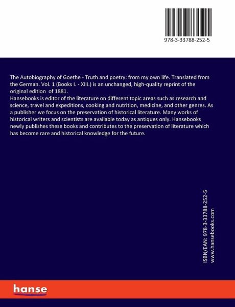 The Autobiography of Goethe - Truth and poetry: from my own life. Translated from the German. Vol. 1 (Books I. - XIII.) is an unchanged, high-quality reprint of the original edition of 1881.Hansebooks is editor of the literature on different topic areas such as research and science, travel and expeditions, cooking and nutrition, medicine, and other genres. As a publisher we focus on the preservation of historical literature. Many works of historical writers and scientists are available today as antiques only. Hansebooks newly publishes these books and contributes to the preservation of literature which has become rare and historical knowledge for the future.