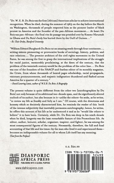 The present volume is quite different from the other two autobiographies by Du Bois not only because of its additional two-decade span, and the significantly altered outlook of its author, but also because in it-unlike the others-he seeks, as he writes, "to review my life as frankly and fully as I can." Of course, with the directness and honesty which so decisively characterized him, he reminds the reader of this book of the intense subjectivity that inevitably permeates autobiography; hence, he writes, he offers this account of his life as he understood it and as he-would like others to believe-it to have been. Certainly, while Dr. Du Bois was deep in his ninth decade when he died, longevity was the least remarkable feature of his life. As editor, author, lecturer, scholar, organizer, inspirer, and fighter, he was among the most consequential figures of the twentieth century. Necessarily, therefore, the full and final accounting of that life and his times becomes an indispensable volume.