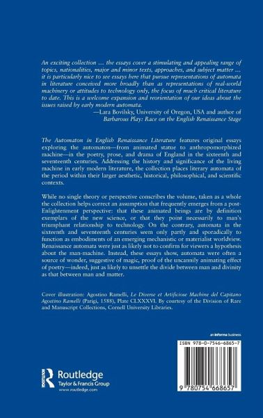 The Automaton in English Renaissance Literature features original essays exploring the automaton-from animated statue to anthropomorphized machine-in the poetry, prose, and drama of England in the 16th and 17th centuries. Addressing the history and significance of the living machine in early modern literature, the collection places literary automata of the period within their larger aesthetic, historical, philosophical, and scientific contexts. While no single theory or perspective conscribes the volume, taken as a whole the collection helps correct an assumption that frequently emerges from a post-Enlightenment perspective: that these animated beings are by definition exemplars of the new science, or that they point necessarily to man's triumphant relationship to technology. On the contrary, automata in the sixteenth and seventeenth centuries seem only partly and sporadically to function as embodiments of an emerging mechanistic or materialist worldview. Renaissance automata were just as likely not to confirm for viewers a hypothesis about the man-machine. Instead, these essays show, automata were often a source of wonder, suggestive of magic, proof of the uncannily animating effect of poetry-indeed, just as likely to unsettle the divide between man and divinity as that between man and matter.