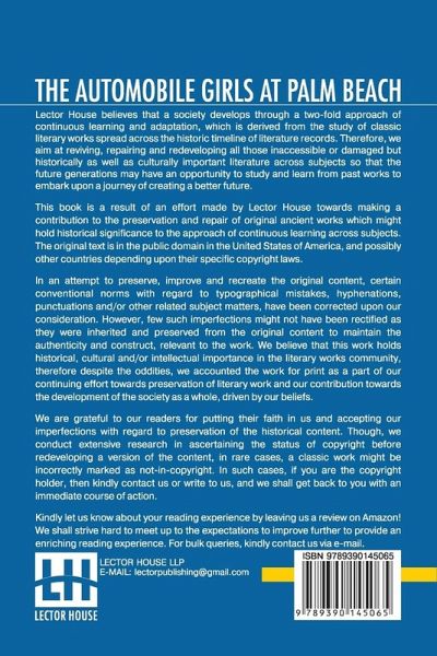 The Automobile Girls At Palm Beach: Or Proving Their Mettle Under Southern Skies This book is a result of an effort made by us towards making a contribution to the preservation and repair of original classic literature. In an attempt to preserve, improve and recreate the original content, we have worked towards: 1. Type-setting & Reformatting: The complete work has been re-designed via professional layout, formatting and type-setting tools to re-create the same edition with rich typography, graphics, high quality images, and table elements, giving our readers the feel of holding a 'fresh and newly' reprinted and/or revised edition, as opposed to other scanned & printed (Optical Character Recognition - OCR) reproductions. 2. Correction of imperfections: As the work was re-created from the scratch, therefore, it was vetted to rectify certain conventional norms with regard to typographical mistakes, hyphenations, punctuations, blurred images, missing content/pages, and/or other related subject matters, upon our consideration. Every attempt was made to rectify the imperfections related to omitted constructs in the original edition via other references. However, a few of such imperfections which could not be rectified due to intentional\unintentional omission of content in the original edition, were inherited and preserved from the original work to maintain the authenticity and construct, relevant to the work. We believe that this work holds historical, cultural and/or intellectual importance in the literary works community, therefore despite the oddities, we accounted the work for print as a part of our continuing effort towards preservation of literary work and our contribution towards the development of the society as a whole, driven by our beliefs. We are grateful to our readers for putting their faith in us and accepting our imperfections with regard to preservation of the historical content. HAPPY READING!