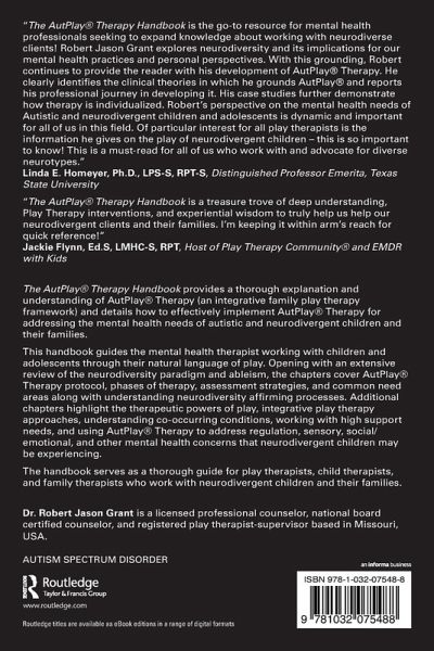 This handbook guides the mental health therapist working with children and adolescents through their natural language of play. Opening with an extensive review of the neurodiversity paradigm and ableism, the chapters cover AutPlay® Therapy protocol, phases of therapy, assessment strategies, and common need areas along with understanding neurodiversity affirming processes. Additional chapters highlight the therapeutic powers of play, integrative play therapy approaches, understanding co-occurring conditions, working with high support needs, and using AutPlay® Therapy to address regulation, sensory, social/emotional, and other mental health concerns that neurodivergent children may be experiencing.