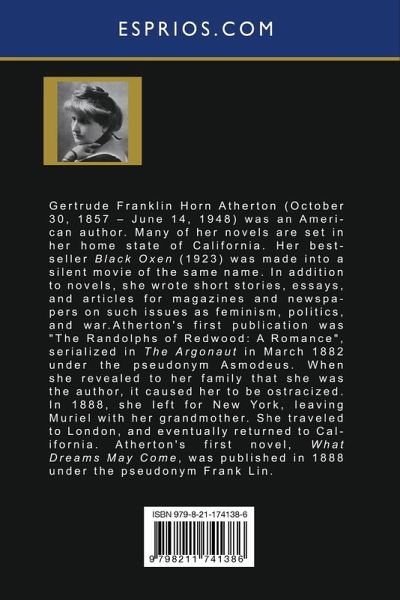 Gertrude Franklin Horn Atherton (October 30, 1857 - June 14, 1948) was an American author. Many of her novels are set in her home state of California. Her bestseller Black Oxen (1923) was made into a silent movie of the same name. In addition to novels, she wrote short stories, essays, and articles for magazines and newspapers on such issues as feminism, politics, and war. Atherton's first publication was "The Randolphs of Redwood: A Romance", serialized in The Argonaut in March 1882 under the pseudonym Asmodeus. When she revealed to her family that she was the author, it caused her to be ostracized. In 1888, she left for New York, leaving Muriel with her grandmother. She traveled to London, and eventually returned to California. Atherton's first novel, What Dreams May Come, was published in 1888 under the pseudonym Frank Lin.