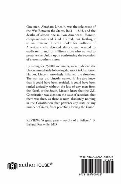 One man, Abraham Lincoln, was the sole cause of the War Between the States, l861 - 1865, and the deaths of almost one million Americans. Honest, compassionate and kind hearted, but forthright to an extreme, Lincoln spoke for millions of Americans who detested slavery, and wanted to eradicate it, and for millions more who wanted to preserve the Union upon confronting the secession of eleven southern states By calling for 75,000 volunteers, men to defend the Union immediately following the attack in Charleston Harbor, Lincoln knowingly inflamed the situation. The war was on. Lincoln wanted it. He also knew that it could have been avoided, it could have been settled amicably without the loss of any men from the North or the South. Lincoln knew that the U.S. Constitution was silent on the issue of secession, that there was then, as there is now, absolutely nothing in the Constitution that prevents any state or any number of states, from peacefully leaving the Union. REVIEW: "A great yarn - worthy of a Pulitzer." B. Ballard, Rockville, MD