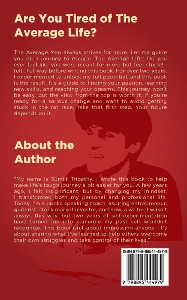 The Average Man always strives for more. Let me guide you on a journey to escape 'The Average Life.' Do you ever feel like you were meant for more but feel stuck? I felt that way before writing this book. For over two years, I experimented to unlock my full potential, and this book is the result. It's a guide to finding your passion, learning new skills, and reaching your dreams. This journey won't be easy, but the view from the top is worth it. If you're ready for a serious change and want to avoid getting stuck in the rat race, take that first step. Your future depends on it.