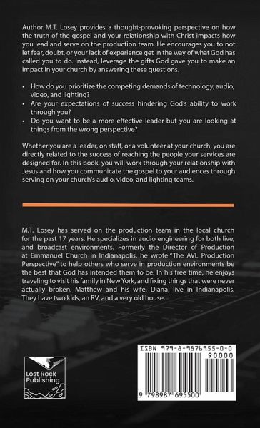 Author M.T. Losey provides a thought-provoking perspective on how the truth of the gospel and your relationship with Christ impacts how you lead and serve on the production team. He encourages you to not let fear, doubt, or your lack of experience get in the way of what God has called you to do. Instead, leverage the gifts God gave you to make an impact in your church by answering these questions. -How do you prioritize the competing demands of technology, audio, video, and lighting? -Are your expectations of success hindering God's ability to work through you? -Do you want to be a more effective leader but you are looking at things from the wrong perspective? Whether you are a leader, on staff, or a volunteer at your church, you are directly related to the success of reaching the people your services are designed for. In this book, you will work through your relationship with Jesus and how you communicate the gospel to your audiences through serving on your church's audio, video, and lighting teams.