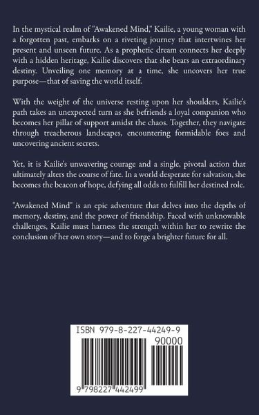 In the mystical realm of "Awakened Mind," Kailie, a young woman with a forgotten past, embarks on a riveting journey that intertwines her present and unseen future. As a prophetic dream connects her deeply with a hidden heritage, Kailie discovers that she bears an extraordinary destiny. Unveiling one memory at a time, she uncovers her true purpose-that of saving the world itself. With the weight of the universe resting upon her shoulders, Kailie's path takes an unexpected turn as she befriends a loyal companion who becomes her pillar of support amidst the chaos. Together, they navigate through treacherous landscapes, encountering formidable foes and uncovering ancient secrets. Yet, it is Kailie's unwavering courage and a single, pivotal action that ultimately alters the course of fate. In a world desperate for salvation, she becomes the beacon of hope, defying all odds to fulfill her destined role. "Awakened Mind" is an epic adventure that delves into the depths of memory, destiny, and the power of friendship. Faced with unknowable challenges, Kailie must harness the strength within her to rewrite the conclusion of her own story-and to forge a brighter future for all.