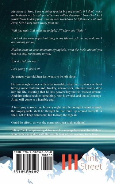 My name is Sam. I am nothing special but apparently if I don’t wake up, both this world and that other one will be destroyed. Nice One! All I wanted was to disappear into my own world and be left alone. But, No! Even THAT was taken away from me. Well just wait. You want me to fight? I’ll show you "fight." You took the most important thing in my life away from me, and now I am coming for you. Hidden away in your mountain stronghold, even the rocks around you will not stop me getting to you. You started this war. I am going to finish it! Seventeen year old Sam just wants to be left alone! He has enough to cope with in his invisible, suburban, existence without having some fantastic and, frankly, unasked-for, alternate reality drop into his life asserting that he has powers beyond his wildest dreams. And that unless he does something, both his world, and that of Muanga-Atua, will come to a horrible end. A terrifying episode one blustery night may be enough to start to erode the impregnable shell he thought he had built up around himself. A shell, not to keep others out, but to keep the rage in. Could he afford, as was the norm now, just to do nothing? Julian Cheek’s captivating debut novel is a compulsive read for all those who battle every day with the simple task of just wanting to be heard.