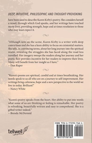 Deep, intuitive, philosophic and thought- provoking have been used to describe Karen Kirby's poetry. She considers herself a vessel, through which God speaks, and her writings have touched many lives, providing strength, hope and at times resolution to those who may least expect it. "Although new on the scene, Karen Kirby is a writer with deep convictions and she has a keen ability to focus on existential matters. She tells, in convincing terms, about her long journey into the spiritual realm, revealing the struggles she has faced along the road less travelled. Her imagery sweeps the readers along her journey and her poetic flair provides incentive for her readers to improve their lives. Many will benefit from her insight as I have." Don Raper