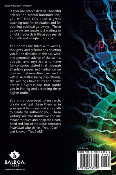 If you are interested in "Mindful Science" or "Mental Transmutation," you will find this book a great teaching tool for inspiration and for opening spiritual gateways. These gateways are within just waiting to unfold in your daily life as you search for truth and a higher purpose. The poems are filled with words, thoughts, and affirmations pointing you in the direction of the old, wise, and perennial advice of the saints, adepts, and mystics who have for centuries stated that through attention, prayer, and meditation we discover that everything we need is within. As well as being inspirational, the writings have titles and some acrostic expressions that guide you in finding and accessing these higher truths. You are encouraged to research, create and test these theories in your quest to understand your path to create the authentic you. These writings are transformative and are meant to touch and open the Heart, Mind and Soul of the active, conscious individual who thinks, "Yes, I Can" – and knows – "Yes, I AM."