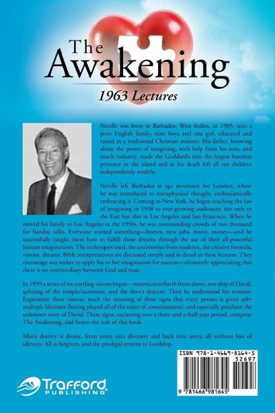 If one is looking for answers to the meaning of life and how to make a happier, richer existence-e.g., relationships, finances, health-then Neville's teaching from personal experience, testimonies from students, and his amazing visions paralleling and explaining the mysteries of the Old and New Testament will answer those questions. Learn his techniques, unleash your power to create, believe in your imaginal acts, and no power in this world can stop the desired results from appearing in your world. It's the only creative power, one that everyone is operating moment to moment. Learning how to direct it deliberately is essential to producing loving, positive changes in one's life. These 1963 lectures also begin a nine-year odyssey of discovering the deepest meanings of six visions of the End that had unfolded in Neville (1959-1963). The visions are the signs that this long journey as limited man, the terrible opacity and contraction, is over, that the purpose of human life has been completed-man has endured and overcome six thousand years of amnesia plus the fires of experience and has emerged victorious. He's been transformed by his inner being (I AM, God) back into the divinity he truly is . . . and always was.