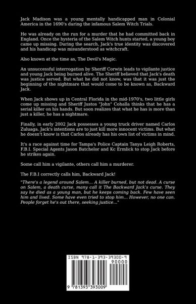 Jack Madison was a young mentally handicapped man in Colonial America in the 1690's during the infamous Salem Witch Trials. He was already on the run for a murder that he had committed back in England. Once the hysteria of the Salem Witch hunts started, a young boy came up missing. During the search, Jack's true identity was discovered and his handicap was misunderstood as witchcraft. Also known at the time as, The Devil's Magic. An unsuccessful interrogation by Sheriff Corwin leads to vigilante justice and young Jack being burned alive. The Sheriff believed that Jack's death was justice served. But what he did not know, was that it was just the beginning of the nightmare that would come to be known as, Backward Jack. When Jack shows up in Central Florida in the mid-1970's, two little girls come up missing and Sheriff Justos "John" Cohalla thinks that he has a serial killer on his hands. But soon realizes that what he has is more than just a killer, he has a nightmare. Finally, in early 2002 Jack possesses a young truck driver named Carlos Zuluaga. Jack's intentions are to just kill more innocent victims. But what he doesn't know is that Carlos already has his own list of victims in mind. It's a race against time for Tampa's Police Captain Tanya Leigh Roberts, F.B.I. Special Agents Jason Batchelor and Kc Ermlick to stop Jack before he strikes again. Some call him a vigilante, others call him a murderer. The F.B.I correctly calls him, Backward Jack! "There's a legend around Salem… A killer burned, but not dead. A curse on Salem, a death curse, many call it The Backward Jack's curse. They say he died as a young man, but he keeps coming back. Few have seen him and lived. Some have even tried to stop him... However, no one can. People forget he's out there, seeking justice..."