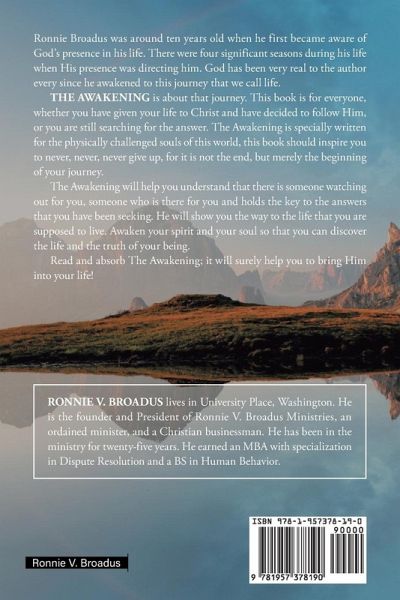Ronnie Broadus was around ten years old when he first became aware of God's presence in his life. There were four significant seasons during his life when His presence was directing him. God has been very real to the author every since he awakened to this journey that we call life. THE AWAKENING is about that journey. This book is for everyone, whether you have given your life to Christ and have decided to follow Him, or you are still searching for the answer. The Awakening is specially written for the physically challenged souls of this world, this book should inspire you to never, never, never give up, for it is not the end, but merely the beginning of your journey. The Awakening will help you understand that there is someone watching out for you, someone who is there for you and holds the key to the answers that you have been seeking. He will show you the way to the life that you are supposed to live. Awaken your spirit and your soul so that you can discover the life and the truth of your being. Read and absorb The Awakening; it will surely help you to bring Him into your life!