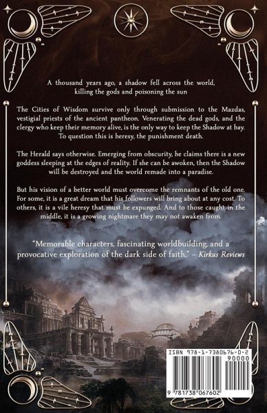 A thousand years ago, a shadow fell across the world, killing the gods and poisoning the sun. The Cities of Wisdom survive only through submission to the Mazdas, vestigial priests of the ancient pantheon. Venerating the dead gods, and the clergy who keep their memory alive, is the only way to keep the Shadow at bay. To question this is heresy, the punishment is death. The Herald says otherwise. Emerging from obscurity, he claims there is a new goddess sleeping at the edges of reality. If she can be awoken, then the Shadow will be destroyed and the world remade into a paradise. But his vision of a better world must overcome the remnants of the old one. For some, it is a great dream that his followers will bring about at any cost. To others, it is a vile heresy that must be expunged. And to those caught in the middle, it is a growing nightmare they may not awaken from.