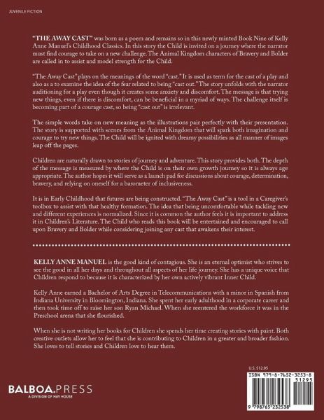 "The Away Cast" was born as a poem and remains so in this newly minted Book Nine of Kelly Anne Manuel's Childhood Classics. In this story the Child is invited on a journey where the narrator must find courage to take on a new challenge. The Animal Kingdom characters of Bravery and Bolder are called in to assist and model strength for the Child. "The Away Cast" plays on the meanings of the word "cast." It is used as term for the cast of a play and also as a to examine the idea of the fear related to being "cast out." The story unfolds with the narrator auditioning for a play even though it creates some anxiety and discomfort. The message is that trying new things, even if there is discomfort, can be beneficial in a myriad of ways. The challenge itself is becoming part of a courage cast, so being "cast out" is irrelevant. The simple words take on new meaning as the illustrations pair perfectly with their presentation. The story is supported with scenes from the Animal Kingdom that will spark both imagination and courage to try new things. The Child will be ignited with dreamy possibilities as all manner of images leap off the pages. Children are naturally drawn to stories of journey and adventure. This story provides both. The depth of the message is measured by where the Child is on their own growth journey so it is always age appropriate. The author hopes it will serve as a launch pad for discussions about courage, determination, bravery, and relying on oneself for a barometer of inclusiveness. It is in Early Childhood that futures are being constructed. "The Away Cast" is a tool in a Caregiver's toolbox to assist with that healthy formation. The idea that being uncomfortable while tackling new and different experiences is normalized. Since it is common the author feels it is important to address in Children's Literature. The Child who reads this book will be entertained and encouraged to call upon Bravery and Bolder while considering joining any cast that awakens their interest.