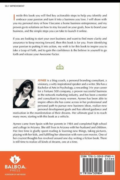Inside this book you will find key actionable steps to help you identify and embrace your passion and turn it into a business you love. I will share with you my personal story of how I became a home business entrepreneur, and my proven go-to solutions on how to stay focused on your goals, how to brand your business, and the simple steps you can take to launch it online. If you are looking to start your own business and want to find more clarity and assurance to keep moving forward, then this book is for you. From identifying your passion to putting it into action, my wish is for this book to inspire you to take a Leap of Faith, and to gain the confidence & the believe in yourself to go forth and release your Awesome Factor.