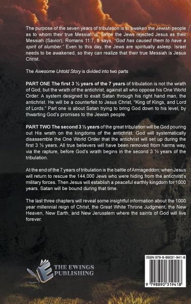 The purpose of the seven years of tribulation is to awaken the Jewish people as to whom their true Messiah is. Since the Jews rejected Jesus as their Messiah (Savior); Romans 11:7, 8 says, "God has caused them to have a spirit of slumber." Even to this day, the Jews are spiritually asleep. Israel needs to be awakened, so they can realize that their true Messiah is Jesus Christ. The Awesome Untold Story is divided into two parts PART ONE The first 3 ¿ years of the 7 years of tribulation is not the wrath of God, but the wrath of the antichrist, against all who oppose his One World Order. A system designed to exalt Satan through his right hand man, the antichrist. He will be a counterfeit to Jesus Christ, "King of Kings, and Lord of Lords." Part one is about Satan trying to bring God down to his level, by thwarting God's promises to the Jewish people. PART TWO The second 3 ¿ years of the great tribulation will be God pouring out His wrath on the kingdoms of the antichrist. God will systematically disassemble the One World Order that the antichrist will set up during the first 3 ¿ years. All true believers will have been removed from harms way, via the rapture, before God's wrath begins in the second 3 ¿ years of the tribulation. At the end of the 7 years of tribulation is the battle of Armageddon; when Jesus will return to rescue the 144,000 Jews who were hiding from the antichrist's military forces. Then Jesus will establish a peaceful earthly kingdom for 1000 years. Satan will be bound during that time. The last three chapters will reveal some insightful information about the 1000 year millennial reign of Christ, the Great White Throne Judgment, the New Heaven, New Earth, and New Jerusalem where the saints of God will live forever.