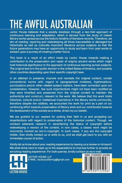 The Awful Australian This book is a result of an effort made by us towards making a contribution to the preservation and repair of original classic literature. In an attempt to preserve, improve and recreate the original content, we have worked towards: 1. Type-setting & Reformatting: The complete work has been re-designed via professional layout, formatting and type-setting tools to re-create the same edition with rich typography, graphics, high quality images, and table elements, giving our readers the feel of holding a 'fresh and newly' reprinted and/or revised edition, as opposed to other scanned & printed (Optical Character Recognition - OCR) reproductions. 2. Correction of imperfections: As the work was re-created from the scratch, therefore, it was vetted to rectify certain conventional norms with regard to typographical mistakes, hyphenations, punctuations, blurred images, missing content/pages, and/or other related subject matters, upon our consideration. Every attempt was made to rectify the imperfections related to omitted constructs in the original edition via other references. However, a few of such imperfections which could not be rectified due to intentional\unintentional omission of content in the original edition, were inherited and preserved from the original work to maintain the authenticity and construct, relevant to the work. We believe that this work holds historical, cultural and/or intellectual importance in the literary works community, therefore despite the oddities, we accounted the work for print as a part of our continuing effort towards preservation of literary work and our contribution towards the development of the society as a whole, driven by our beliefs. We are grateful to our readers for putting their faith in us and accepting our imperfections with regard to preservation of the historical content. HAPPY READING!