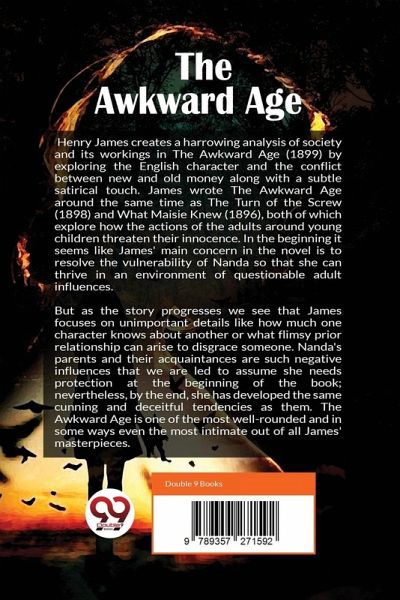 Henry James creates a harrowing analysis of society and its workings in The Awkward Age (1899) by exploring the English character and the conflict between new and old money along with a subtle satirical touch. James wrote The Awkward Age around the same time as The Turn of the Screw (1898) and What Maisie Knew (1896), both of which explore how the actions of the adults around young children threaten their innocence. In the beginning it seems like James' main concern in the novel is to resolve the vulnerability of Nanda so that she can thrive in an environment of questionable adult influences. But as the story progresses we see that James focuses on unimportant details like how much one character knows about another or what flimsy prior relationship can arise to disgrace someone. Nanda's parents and their acquaintances are such negative influences that we are led to assume she needs protection at the beginning of the book; nevertheless, by the end, she has developed the same cunning and deceitful tendencies as them. The Awkward Age is one of the most well-rounded and in some ways even the most intimate out of all James' masterpieces.