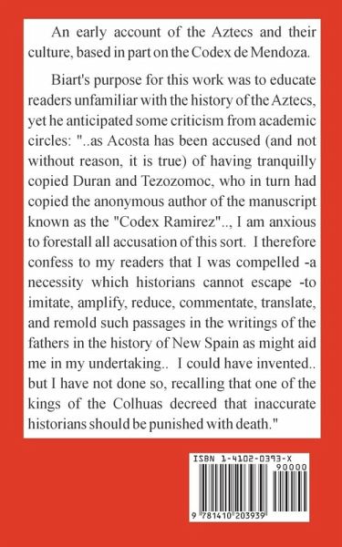 An early account of the Aztecs and their culture, based in part on the Codex de Mendoza. Biart's purpose for this work was to educate readers unfamiliar with the history of the Aztecs, yet he anticipated some criticism from academic circles: "..as Acosta has been accused (and not without reason, it is true) of having tranquilly copied Duran and Tezozomoc, who in turn had copied the anonymous author of the manuscript known as the "Codex Ramirez".., I am anxious to forestall all accusation of this sort. I therefore confess to my readers that I was compelled - a necessity which historians cannot escape - to imitate, amplify, reduce, commentate, translate, and remold such passages in the writings of the fathers in the history of New Spain as might aid me in my undertaking.. I could have invented.. but I have not done so, recalling that one of the kings of the Colhuas decreed that inaccurate historians should be punished with death."
