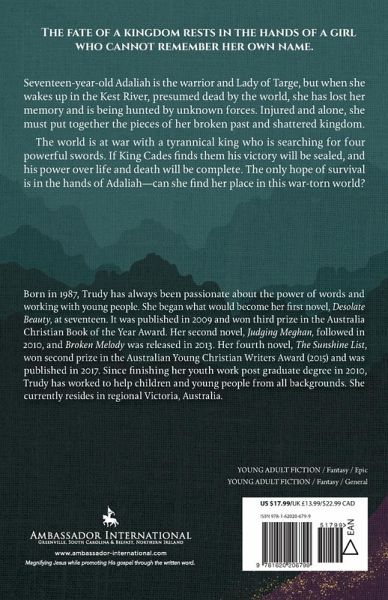 The fate of a kingdom rests in the hands of a girl who cannot remember her own name. Seventeen-year-old Adaliah is the warrior and Lady of Targe, but when she wakes up in the Kest River, presumed dead by the world, she has lost her memory and is being hunted by unknown forces. Injured and alone, she must put together the pieces of her broken past and shattered kingdom. The world is at war with a tyrannical king who is searching for four powerful swords. If King Cades finds them, his victory will be sealed, and his power over life and death will be complete. The only hope of survival is in the hands of Adaliah-can she find her place in this war-torn world?