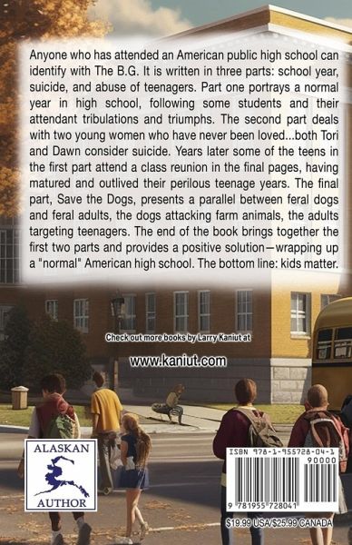 Anyone who has attended an American public high school can identify with The B.G. It is written in three parts: school year, suicide, and abuse of teenagers. Part one portrays a normal year in high school, following some students and their attendant tribulations and triumphs. The second part deals with two young women who have never been loved...both Tori and Dawn consider suicide. Years later some of the teens in the first part attend a class reunion in the final pages, having matured and outlived their perilous teenage years. The final part, Save the Dogs, presents a parallel between feral dogs and feral adults, the dogs attacking farm animals, and the adults targeting teenagers. The end of the book brings together the first two parts and provides a positive solution-wrapping up a "normal" American high school. The bottom line: kids matter.