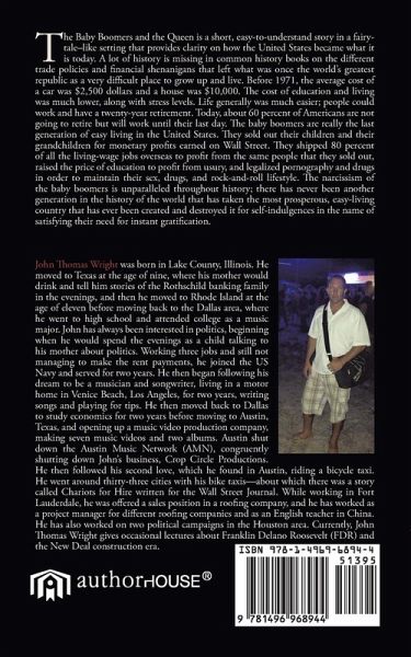 The Baby Boomers and the Queen is a short, easy-to-understand story in a fairy-tale-like setting that provides clarity on how the United States became what it is today. A lot of history is missing in common history books on the different trade policies and financial shenanigans that left what was once the world's greatest republic as a very difficult place to grow up and live. Before 1971, the average cost of a car was $2,500 dollars and a house was $10,000. The cost of education and living was much lower, along with stress levels. Life generally was much easier; people could work and have a twenty-year retirement. Today, about 60 percent of Americans are not going to retire but will work until their last day. The baby boomers are really the last generation of easy living in the United States. They sold out their children and their grandchildren for monetary profits earned on Wall Street. They shipped 80 percent of all the living-wage jobs overseas to profit from the same people that they sold out, raised the price of education to profit from usury, and legalized pornography and drugs in order to maintain their sex, drugs, and rock-and-roll lifestyle. The narcissism of the baby boomers is unparalleled throughout history; there has never been another generation in the history of the world that has taken the most prosperous, easy-living country that has ever been created and destroyed it for self-indulgences in the name of satisfying their need for instant gratification.
