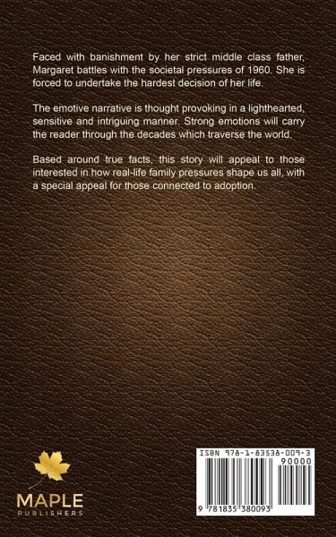 Faced with banishment by her strict middle-class father, Margaret battles with the societal pressures of 1960. She is forced to undertake the hardest decision, which bitterly and painfully remains with her for the rest of her life. The emotive narrative is thought-provoking in a light-hearted, sensitive and intriguing manner. Strong emotions will carry the reader through the decades which traverse the world. Based around true facts, this story will appeal to those interested in how real-life family pressures shape us all, with a special appeal for those connected to adoption.