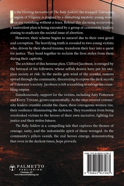 Unseen Heroes Emerge from Shadows: Kidnap Victims Fight Back, Reclaim Stolen Babies Amidst Community Chaos. Society Pillars Vanish as Scandal Shakes Virginia's Tidewater Region. In The Baby Soldiers, a gripping tale of courage and resilience unfolds. Young women are mysteriously vanishing in the Tidewater region of Virginia, their absence barely noticed by the community. Yet, behind this alarming trend, a sinister plot is at play. A group of influential community leaders, driven by a twisted desire to eradicate the issue of abortion, have devised a chilling plan. Their scheme, however, begins to crumble under the weight of their own greed and corruption. The once seamless operation fractures, revealing the horrifying truth of the young victims. Their initial fear and despair transform into a burning desire for retribution. United by their shared trauma, they rally together to reclaim the lives stolen from them during their captivity. Clifford Jacobson, the mastermind behind this nefarious plan, is infuriated by the betrayal of his followers. Their selfish desires have jeopardized his perfect society. As the media catches wind of the scandal, rumors ripple through the community like seismic waves, threatening to expose the dark underbelly of Tidewater's society. Jacobson is left scrambling to salvage his crumbling empire. Meanwhile, support for Amy Patterson, Kerry Trivane, and hundreds of other victims swells. As the community's pillars crumble amidst the chaos, these brave women rise from the ashes, their resilience shining through the darkness. The once overlooked victims are now the heroes of their own story, fighting for justice and their stolen futures. The Baby Soldiers is a riveting exploration of courage in the face of adversity, the power of unity, and the unyielding spirit of those wronged. As community leaders vanish, the real heroes emerge, proving that even in the darkest times, hope can still be found.