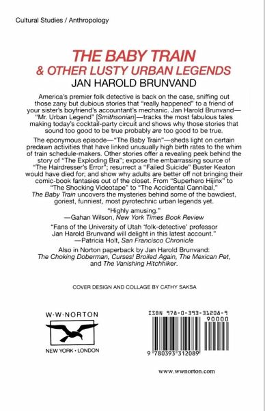 Jan Harold Brunvand-''Mr. Urban Legend" [Smithsonian]-tracks the most fabulous tales making today's cocktail-party circuit and shows why those stories that sound too good to be true probably are too good to be true. The eponymous episode-"The Baby Train"-sheds light on certain predawn activities that have linked unusually high birth rates to the whim of train schedule makers. Other stories offer a revealing peek behind the story of "The Exploding Bra," expose the embarrassing source of "The Hairdresser's Error," resurrect a "Failed Suicide" Buster Keaton would have died for, and show why adults are better off not bringing their comic book fantasies out of the closet. From "Superhero Hijinx" to "The Shocking Videotape" to "The Accidental Cannibal," The Baby Train uncovers the mysteries behind some of the bawdiest, goriest, funniest, most pyrotechnic urban legends yet.