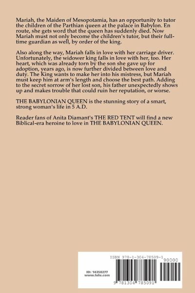 Mariah, the Maiden of Mesopotamia, has an opportunity to tutor the children of the Parthian queen at the palace in Babylon. En route, she gets word that the queen has suddenly died. Now Mariah must not only become the children's tutor, but their full-time guardian as well, by order of the king. Also along the way, Mariah falls in love with her carriage driver. Unfortunately, the widower king falls in love with her, too. Her heart, which was already torn by the son she gave up for adoption, years ago, is now further divided between love and duty. The King wants to make her into his mistress, but Mariah must keep him at arm's length and choose the best path. Adding to the secret sorrow of her lost son, his father unexpectedly shows up and makes trouble that could ruin her reputation, or worse. THE BABYLONIAN QUEEN is the stunning story of a smart, strong woman's life in 5 A.D. Reader fans of Anita Diamant's THE RED TENT will find a new Biblical-era heroine to love in THE BABYLONIAN QUEEN.