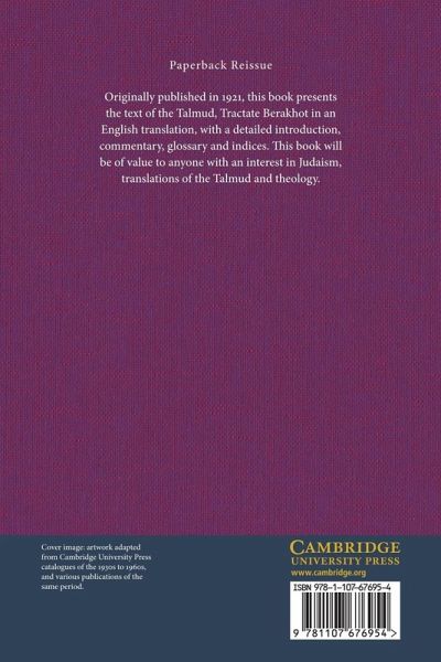 Originally published in 1921, this book presents the text of the Talmud, Tractate Berakhot in an English translation, with a detailed introduction, commentary, glossary and indices. This book will be of value to anyone with an interest in Judaism, translations of the Talmud and theology.