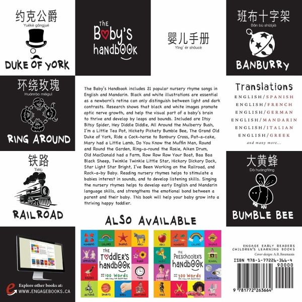The Baby's Handbook includes 21 popular nursery rhyme songs in English and Mandarin. Black and white illustrations are essential as a newborn's retina can only distinguish between light and dark contrasts. Research shows that black and white images promote optic nerve growth, and help the visual part of a baby's brain to thrive and develop by leaps and bounds. Included are Itsy Bitsy Spider, Hey Diddle Diddle, All Around the Mulberry Bush, I'm a Little Tea Pot, Hickety Pickety Bumble Bee, The Grand Old Duke of York, Ride a Cock-horse to Banbury Cross, Pat-a-cake, Mary had a Little Lamb, Do You Know the Muffin Man, Round and Round the Garden, Ring-a-round the Rosie, Aiken Drum, Old MacDonald had a Farm, Row Row Row Your Boat, Baa Baa Black Sheep, Twinkle Twinkle Little Star, Hickory Dickory Dock, Star Light Star Bright, I've Been Working on the Railroad, and Rock-a-by Baby. Reading nursery rhymes helps to stimulate a babies interest in sounds, and to develop listening skills. Singing the nursery rhymes helps to develop early English and Mandarin language skills, and strengthens the emotional bond between a parent and their baby. This book will help your baby grow into a thriving happy toddler.