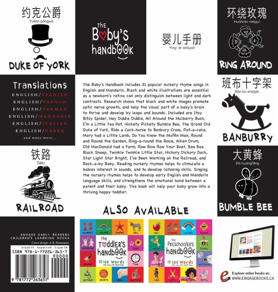The Baby's Handbook includes 21 popular nursery rhyme songs in English and Mandarin. Black and white illustrations are essential as a newborn's retina can only distinguish between light and dark contrasts. Research shows that black and white images promote optic nerve growth, and help the visual part of a baby's brain to thrive and develop by leaps and bounds. Included are Itsy Bitsy Spider, Hey Diddle Diddle, All Around the Mulberry Bush, I'm a Little Tea Pot, Hickety Pickety Bumble Bee, The Grand Old Duke of York, Ride a Cock-horse to Banbury Cross, Pat-a-cake, Mary had a Little Lamb, Do You Know the Muffin Man, Round and Round the Garden, Ring-a-round the Rosie, Aiken Drum, Old MacDonald had a Farm, Row Row Row Your Boat, Baa Baa Black Sheep, Twinkle Twinkle Little Star, Hickory Dickory Dock, Star Light Star Bright, I've Been Working on the Railroad, and Rock-a-by Baby. Reading nursery rhymes helps to stimulate a babies interest in sounds, and to develop listening skills. Singing the nursery rhymes helps to develop early English and Mandarin language skills, and strengthens the emotional bond between a parent and their baby. This book will help your baby grow into a thriving happy toddler.