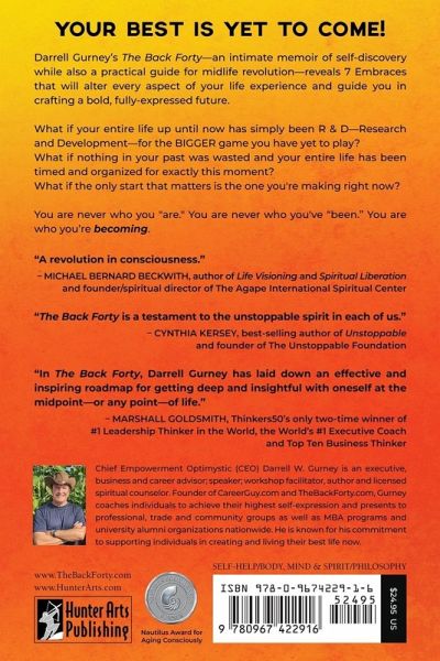 What if your entire life up until now has simply been R & D-Research and Development-for the BIGGER game you have yet to play? What if nothing in your past was wasted and your entire life has been timed and organized for exactly this moment? What if the only start that matters is the one you're making right now? Approaching middle age and mired in a half-million-dollar custody suit, Darrell Gurney sat in his chair late one evening watching his eight-year-old son sleeping and wondered if he had epically failed at living. Career chaos, divorce, and a desperate fight to stay in his boy's life-what did he have to show for his first forty years? His answer, inspired by his real story, you now hold in your hands. It can help you find your answers too. . Winner of the esteemed Nautilus Award for Aging Consciously, Darrell Gurney's The Back Forty-an intimate memoir of self-discovery while also a practical guide for midlife revolution-reveals 7 Embraces that will alter every aspect of your life experience and guide you in crafting a bold, fully-expressed future. You are never who you "are." You are never who you've "been." You are who you're becoming. In this book, you'll unearth:How to transform significant, victim-laced experiences from the past and present to create a free-flying future How to take inventory of current-day gifts and values to awaken to the individual you've become and are still becoming How to flip the concept of midlife crisis into opportunity and initiation into a second half of your greatest Self-expression How to adopt an easy and playful practice of purpose while dropping any heavy and pressured pursuit of it How to engage in ego-freeing and availability-enhancing practices to collaborate with a Universal energy at your service and by your side Considering the enormous costs, struggle and heartache often associated with big midlife changes - whether it be a half-million-dollar custody suit, an expensive divorce, the lost time from an unwanted career change or business failure, or the health challenges brought about by extreme stress - your investment in The Back Forty perspective of your next half/best half of life ahead could be the best investment made in a very long time. Get The Back Forty and start cultivating your radical, best-half-of-life future today!