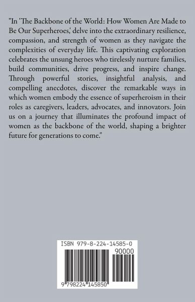 "In 'The Backbone of the World: How Women Are Made to Be Our Superheroes,' delve into the extraordinary resilience, compassion, and strength of women as they navigate the complexities of everyday life. This captivating exploration celebrates the unsung heroes who tirelessly nurture families, build communities, drive progress, and inspire change. Through powerful stories, insightful analysis, and compelling anecdotes, discover the remarkable ways in which women embody the essence of superheroism in their roles as caregivers, leaders, advocates, and innovators. Join us on a journey that illuminates the profound impact of women as the backbone of the world, shaping a brighter future for generations to come."