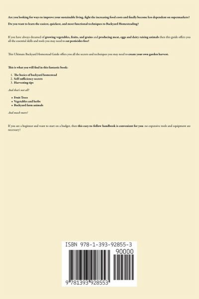 Are you looking for ways to improve your sustainable living, fight the increasing food costs and finally become less dependent on supermarkets? Do you want to learn the easiest, quickest, and most functional techniques to Backyard Homesteading? If you have always dreamed of growing vegetables, fruits, and grains and producing meat, eggs and dairy raising animals then this guide offers you all the essential skills and tools you may need to eat pesticides free! This Ultimate Backyard Homestead Guide offers you all the secrets and techniques you may need to create your own garden harvest. This is what you will find in this fantastic book: The basics of backyard homestead Self-sufficiency secrets Harvesting tips And that's not all! Fruit Trees Vegetables and herbs Backyard farm animals And much more! If you are a beginner and want to start on a budget, then this easy-to-follow handbook is convenient for you: no expensive tools and equipment are necessary!