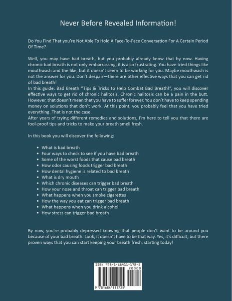 Never Before Revealed Information! Do You Find That you’re Not Able To Hold A Face-To-Face Conversation For A Certain Period Of Time? Well, you may have bad breath, but you probably already know that by now. Having chronic bad breath is not only embarrassing, it is also frustrating. You have tried things like mouthwash and the like, but it doesn’t seem to be working for you. Maybe mouthwash is not the answer for you. Don’t despair—there are other effective ways that you can get rid of bad breath! In this guide, Bad Breath "Tips & Tricks to Help Combat Bad Breath!", you will discover effective ways to get rid of chronic halitosis. Chronic halitosis can be a pain in the butt. However, that doesn’t mean that you have to suffer forever. You don’t have to keep spending money on solutions that don’t work. At this point, you probably feel that you have tried everything. That is not the case. After years of trying different remedies and solutions, I’m here to tell you that there are fool-proof tips and tricks to make your breath smell fresh. In this book you will discover the following: What is bad breath Four ways to check to see if you have bad breath Some of the worst foods that cause bad breath How odor causing foods trigger bad breath How dental hygiene is related to bad breath What is dry mouth Which chronic diseases can trigger bad breath How your nose and throat can trigger bad breath What happens when you smoke cigarettes How the way you eat can trigger bad breath What happens when you drink alcohol How stress can trigger bad breath By now, you’re probably depressed knowing that people don’t want to be around you because of your bad breath. Look, it doesn’t have to be that way. Yes, it’s difficult, but there proven ways that you can start keeping your breath fresh, starting today!