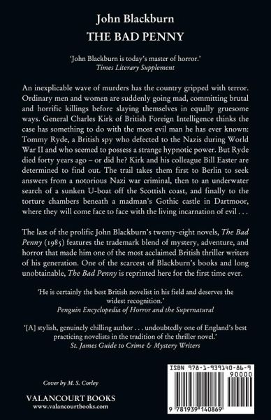 'Our only current writer who can induce such terror as the Grimm Brothers did.' - Times Literary Supplement 'He is certainly the best British novelist in his field and deserves the widest recognition.' - Penguin Encyclopedia of Horror and the Supernatural '[A] stylish, genuinely chilling author ... He can be depended upon to sustain swift, sure, exciting, and absorbing stories ... undoubtedly one of England's best practicing novelists in the tradition of the thriller novel.' - St James Guide to Crime & Mystery Writers An inexplicable wave of murders has the country gripped with terror. Ordinary men and women are suddenly going mad, committing brutal and horrific killings before slaying themselves in equally gruesome ways. General Charles Kirk of British Foreign Intelligence thinks the case has something to do with the most evil man he has ever encountered: Tommy Ryde, a British spy who defected to the Nazis during the Second World War and who seemed to possess a strange hypnotic power. But Ryde has been dead for forty years - or has he? Kirk and his colleague Bill Easter are determined to find out. The trail takes them first to Berlin to seek answers from a notorious Nazi war criminal, then to an underwater search of a sunken U-boat off the Scottish coast, and finally to the torture chambers beneath a madman's Gothic castle in Dartmoor, where they will come face to face with the living incarnation of evil ... The last of the prolific John Blackburn's twenty-eight novels, The Bad Penny (1985) features the trademark blend of mystery, adventure, and horror that made him one of the most acclaimed British thriller writers of his generation. The scarcest of Blackburn's books and long unobtainable, The Bad Penny is reprinted here for the first time ever.