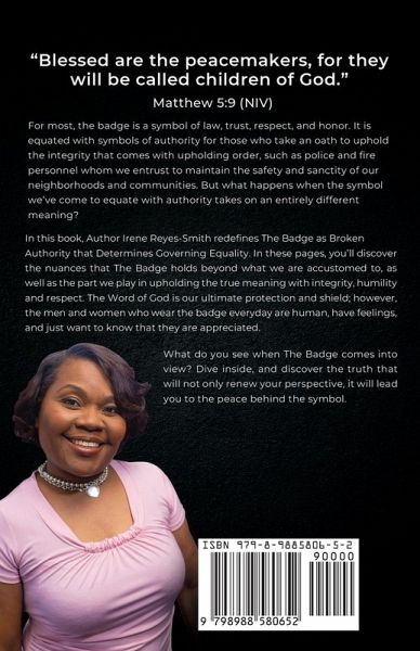 "Blessed are the peacemakers, for they will be called children of God." Matthew 5:9 (NIV) For most, the badge is a symbol of law, trust, respect, and honor. It is equated with symbols of authority for those who take an oath to uphold the integrity that comes with upholding order, such as police and fire personnel whom we entrust to maintain the safety and sanctity of our neighborhoods and communities. But what happens when the symbol we've come to equate with authority takes on an entirely different meaning? In The Badge, Author Irene Reyes-Smith redefines The Badge as Broken Authority that Determines Governing Equality. In these pages, you'll discover the nuances that The Badge holds beyond what we are accustomed to, as well as the part we play in upholding the true meaning with integrity, humility and respect. The Word of God is our ultimate protection and shield; however, the men and women who wear the badge everyday are human, have feelings, and just want to know that they are appreciated. What do you see when The Badge comes into view? Dive inside, and discover the truth that will not only renew your perspective, it will lead you to the peace behind the symbol.